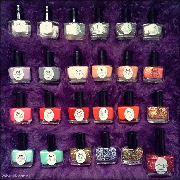 Ik heb zelf ook even alle kleuren uit de kalender gehaald en op kleur gesorteerd. De bovenste lakjes zijn een beetje overbelicht (sorry daarvoor!), maar dat is de basecoat en twee verschillende topcoats.