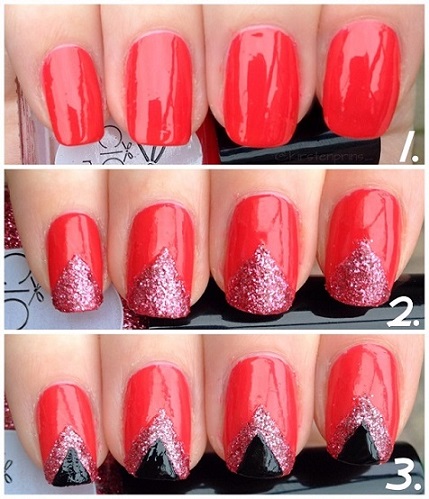Als de glitterlak goed droog is, komt de laatste stap. Met plakband maak je opnieuw driehoekjes, maar maak ze wat kleiner dan de driehoeken die je in stap 2 gemaakt hebt. Het is de bedoeling dat je nu kleinere zwarte driehoekjes maakt in de grotere driehoeken met glitters. Doe hetzelfde als in stap 2, maar gebruik nu een zwarte nagellak. Hier hoef je maar 1 laag van aan te brengen, want zwart dekt meestal erg goed.