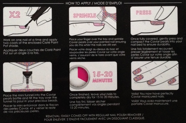Als je de verpakking open maakt, zie je als eerste de caviar pearls en de basislak in de kleur Superficial. Tussen deze lakjes in zit een trechtertje, die is echt super handig. Zo verspil je geen enkele caviar pearl meer! Over de lakjes heen zit een transparant bakje ter bescherming, die moet je niet weggooien! Dat bakje kan je namelijk heel goed gebruiken als je met de caviar pearls over je nagels gaat strooien. Hou je hand boven het bakje zodat de caviar pearls die niet meer op je nagels passen in het bakje vallen, en met behulp van het bakje kan vervolgens de caviar pearls weer super makkelijk in het trechtertje gooien zo terug het flesje in! Er zit ook een instructieboekje bij voor het aanbrengen van deze caviar manicure.