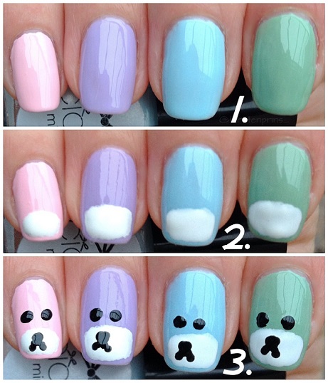 Stap 3: Als de witte cirkels goed droog zijn pak je de dotting pen er weer bij. Maak in elke cirkel een omgekeerde V met daarop een stip. Dat worden de mondjes en de neuzen van de beertjes. En vlak boven elke cirkel maak je ogen door met de dotting pen twee stippen te zetten. Laat alles drogen en breng ten slotte nog een topcoat aan ter bescherming.