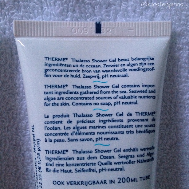 De eerste shower gel die in de verpakking zit is de Thalasso Shower Gel met zeealgen en mineralen. De gel heeft een blauwe kleur en is vrij dik, waardoor je niet veel shower gel nodig hebt. Er zit een beetje een aparte geur aan, het is zeker geen vieze geur maar je moet er even aan wennen (ik heb denk ik te veel zoete doucheproducten in mijn bezit!). Het ruikt een beetje naar de zee en het strand…Lastig om te beschrijven! De shower gel schuimt wel, maar lang niet zo heftig als de meeste douche gels die ik gebruik. Ik hou juist wel van een lekkere schuimboel, dus dat was wel een beetje jammer. Na het douchen voelt mijn huid wel lekker zacht aan, dat is weer een pluspunt!