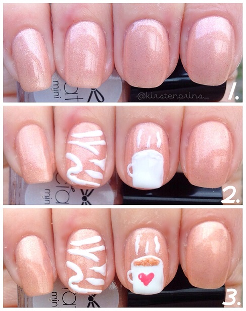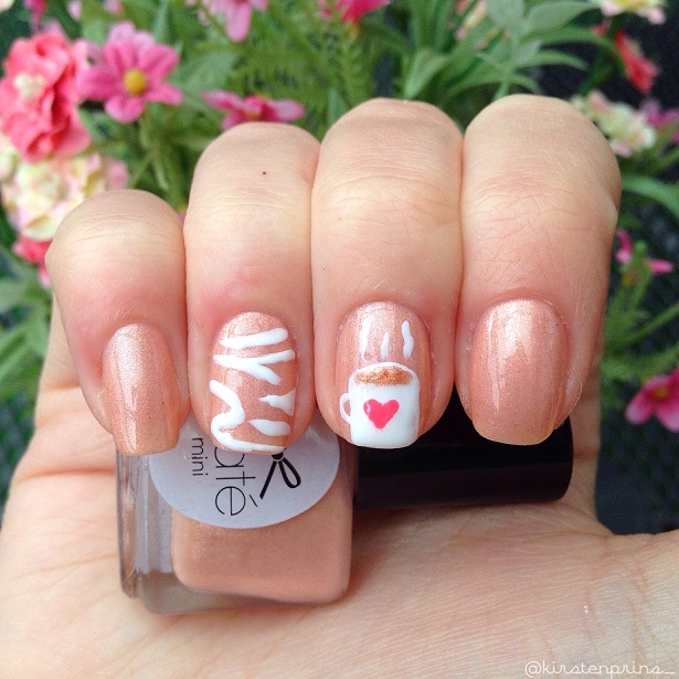 Nu moet de mok alleen nog gevuld worden met warme chocolademelk en voorzien worden van een lief hartje. Met een dotting tool stip je wat bruine (glitter) nagellak in het mokje en teken je een hartje op de mok. Breng een topcoat aan over je design en dan ben je helemaal klaar!