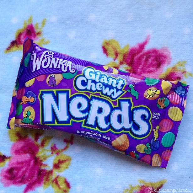 Als laatste heb ik de Giant Chewy Nerds van Wonka. De verpakking ziet er net zo leuk uit als dat van de Gobstoppers met veel kleurtjes. Deze snoepjes kan ik het best omschrijven als Jelly Beans met een krokant laagje. Ze zijn groter dan de gewone Nerds van Wonka en hebben dezelfde smaken als de Gobstoppers: aarbei, druif, watermeloen, citroen en sinaasappel.