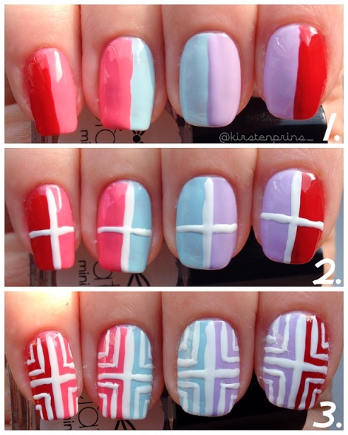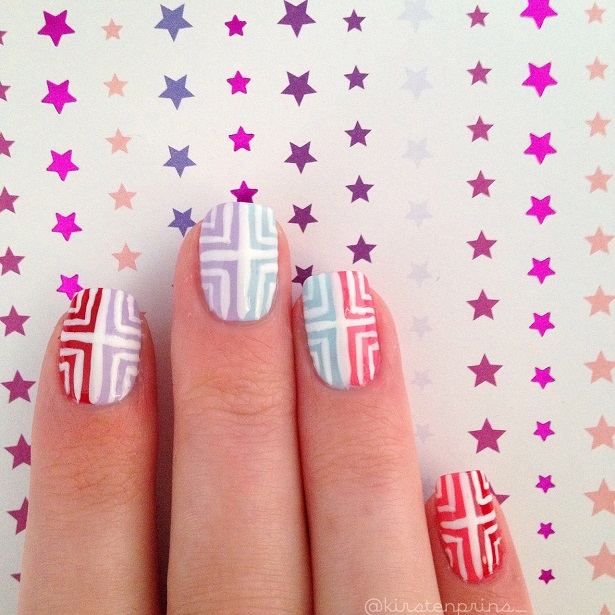 Nu is elke nagel verdeeld in vier gelijke vakken. In elke vak teken je nu nog 2 hoekjes, een grote en een kleinere (zie foto 3). Alle hoeken moeten naar het midden wijzen. Dit doe je weer met een nail art penseel of een witte striper. Als alles goed droog is, breng je nog een topcoat aan over je design en dan ben je klaar!