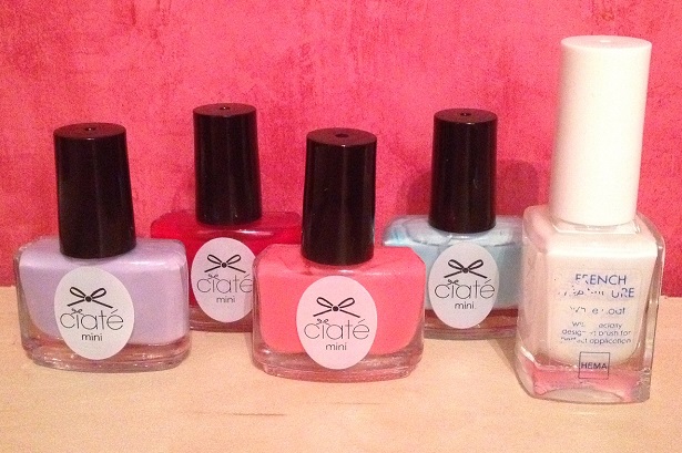Ik heb dit keer geen dotting tool gebruikt maar een French Manicure nagellak van de Hema met een speciaal dun kwastje waar ik de witte lijnen mee getekend heb. Verder heb ik de volgende nagellakjes gebruikt: