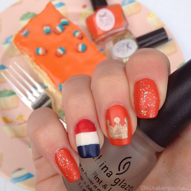 Gisteren was het Koningsdag (ik wil nog steeds elke keer Koninginnedag zeggen!). Ik moest een ochtend werken en mocht dus geen nagellak op. Toch wilde ik nog een leuk oranje design maken. Ik ben dus ’s middags toen ik weer thuis kwam nog even snel aan deze Kingsday nail art gaan werken. Er zitten daarom ook niet veel details in, maar daar wordt het niet minder leuk door! Kijken jullie mee?