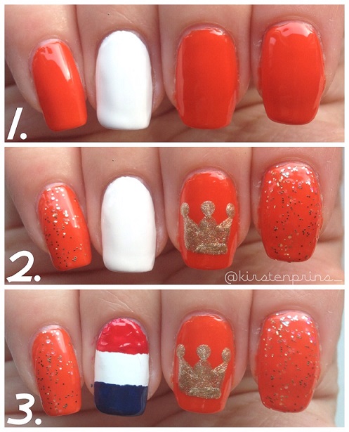 Op je middelvingers teken je een kroon met gouden nagellak, dit kun je het beste doen met een nail art penseel of met een satéprikker. De drie stippen bovenop de kroon maak je met een dotting tool. Op de rest van je nagels die je oranje hebt gelakt breng je nog een glitter topcoat aan voor een feestelijk geheel.