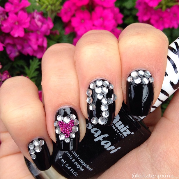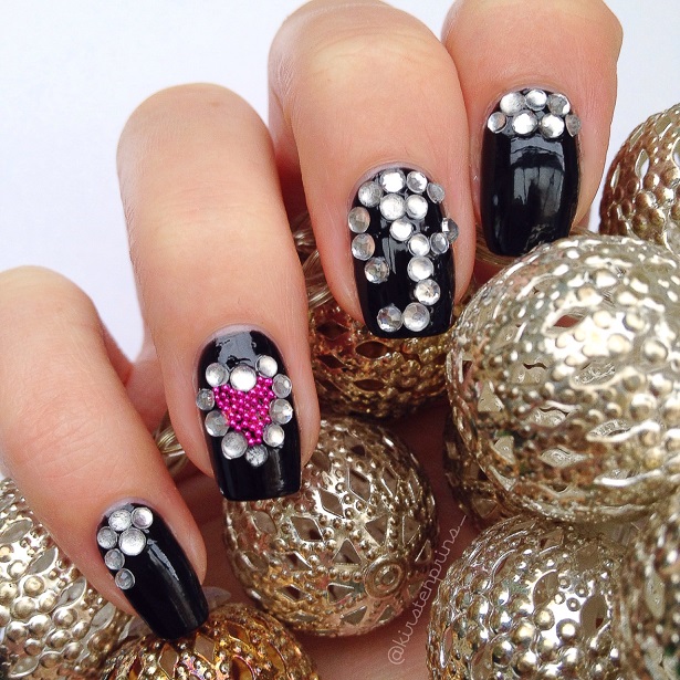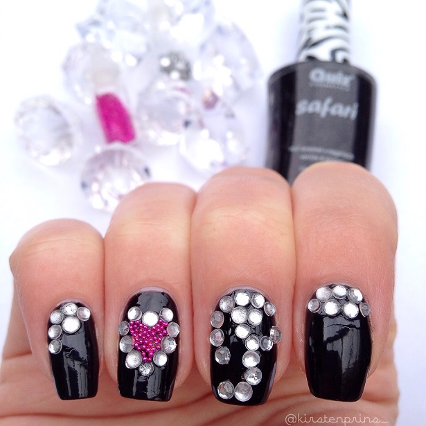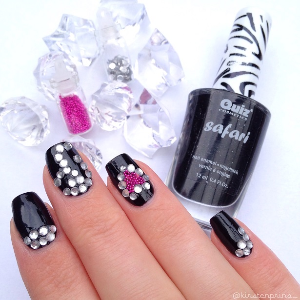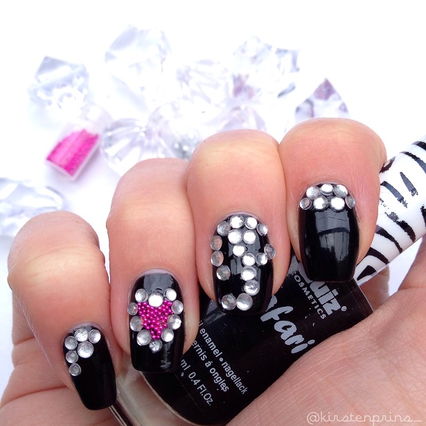 Ik heb deze keer geen stap voor stap foto’s gemaakt omdat je eigenlijk alleen je nagels zwart hoeft te lakken, de steentjes en micro parels er op drukt met een dotting tool als de zwarte lak nog nat is en de boel laat drogen. Er zitten verder geen lastige details in. Let er alleen wel op dat, als je nog een topcoat over je design aan wilt brengen, de kleuren van de micro parels kunnen vervagen of uit kunnen lopen. Druk daarom niet te hard met je nagellak kwastje, het is zelfs het makkelijkst om gewoon een druppel topcoat op de micro parels (dat zijn dus alleen de roze pareltjes) te laten vallen en dan verspreid de topcoat zich vanzelf.