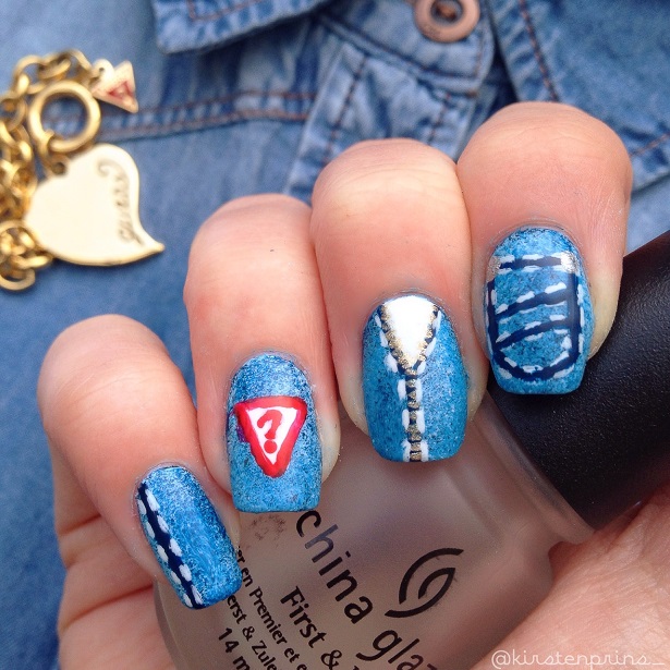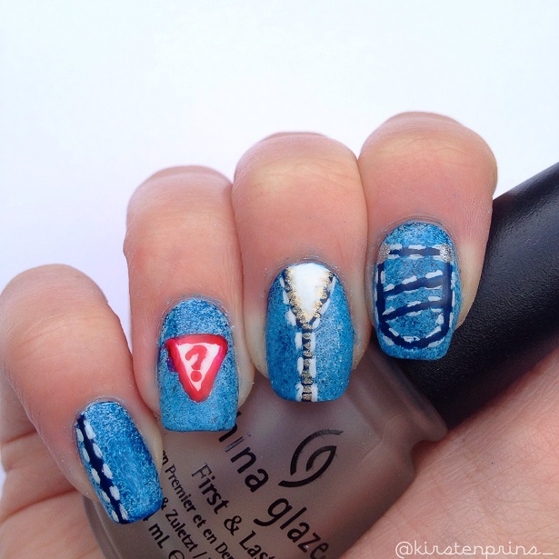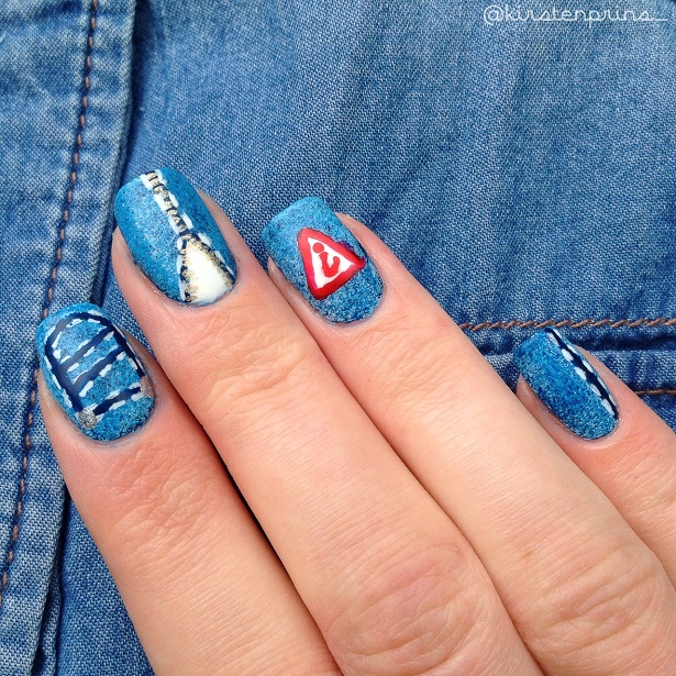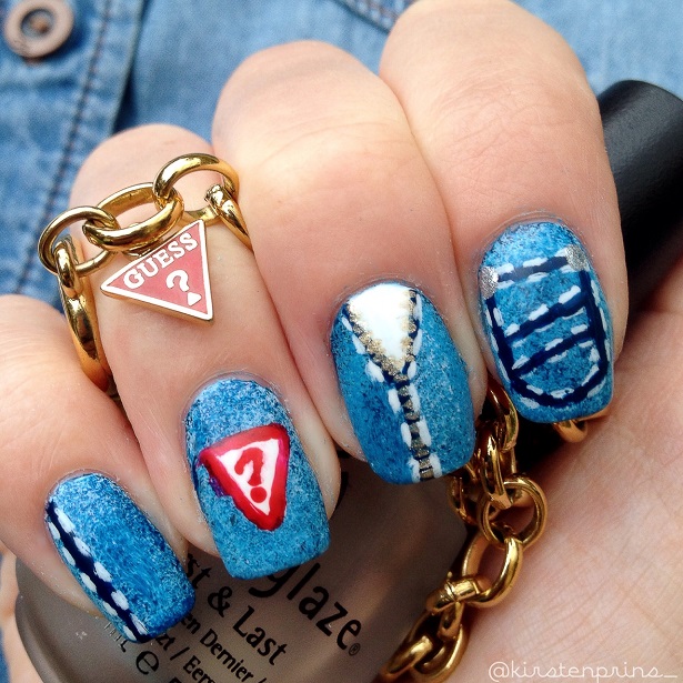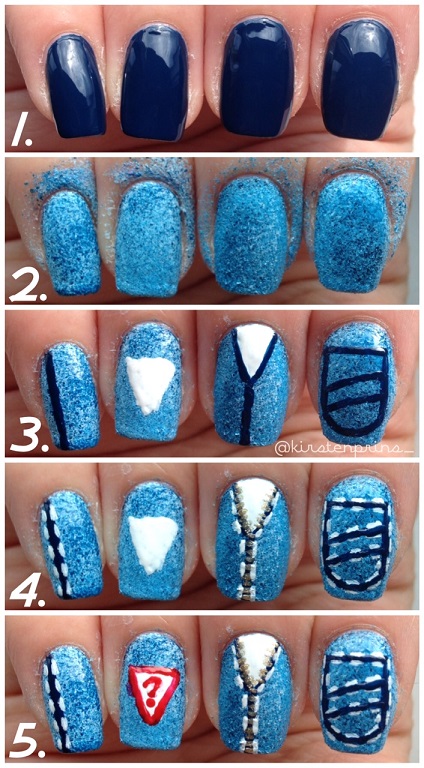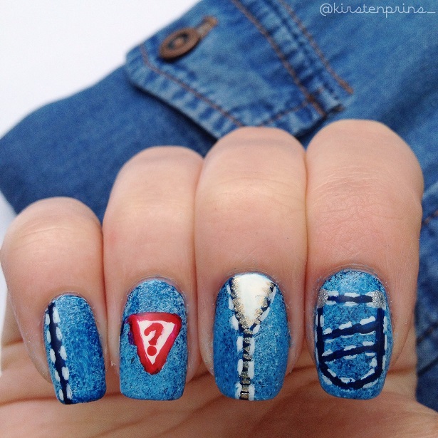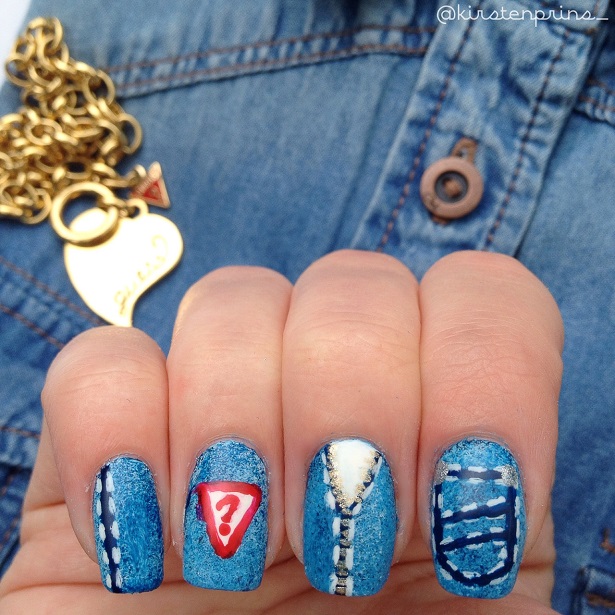 Dit staat niet op de foto bij stap 5, maar ik heb nog twee zilveren stippen aan de puntjes van de broekzakken op mijn wijsvingers gemaakt met een dotting tool. Als je zilveren (of gouden) ronde studs hebt dan kun je die natuurlijk ook gebruiken. Breng nog een (matte) topcoat aan over je nagels en dan is je denim design klaar!