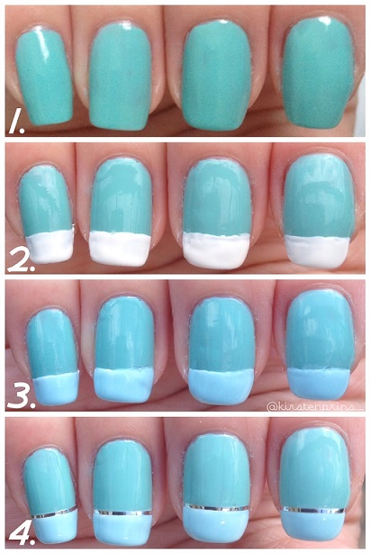 Lak het onderste gedeelte (ongeveer 1/3 deel) van je nagels wit. Deze stap mag je overslaan, maar ik heb eerst een witte nagellak aangebracht zodat de lichtblauwe lak in de volgende stap beter opvalt.