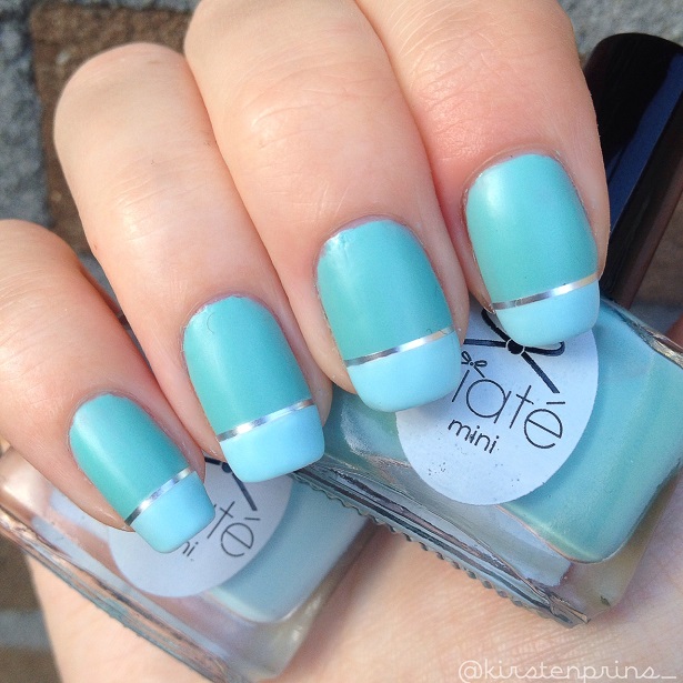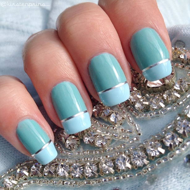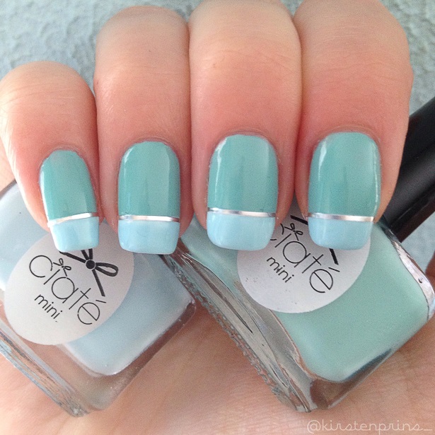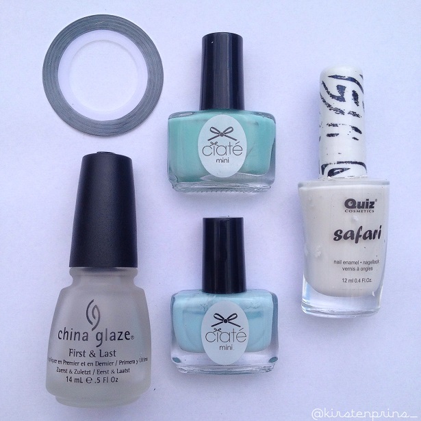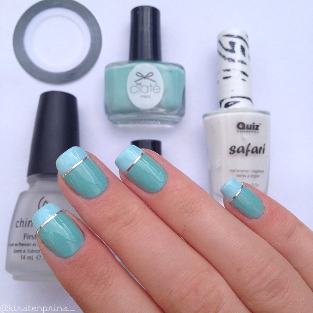 Als de witte nagellak droog is ga je met een lichtblauwe lak over de witte strepen heen. Ik heb twee laagjes ‘Ferris Wheel’ van Ciaté gebruikt voor de lichtblauwe streep.