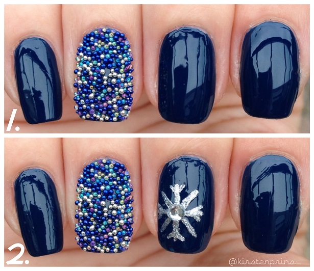 Breng eerst een goede laag base coat aan over je nagels (anders gaat de donkerblauwe kleur van de nagellak in je nagels trekken!) en lak daarna al je nagels donkerblauw. Terwijl de lak nog nat is, strooi je de caviar pearls over je ringvingers. Druk de caviar pearls voorzichtig met je vinger in de nagellak zodat ze beter blijven zitten en laat het daarna rustig drogen.