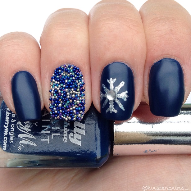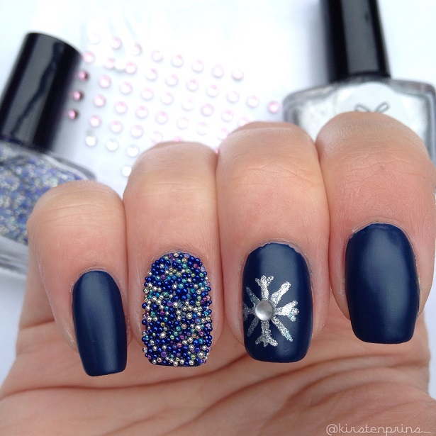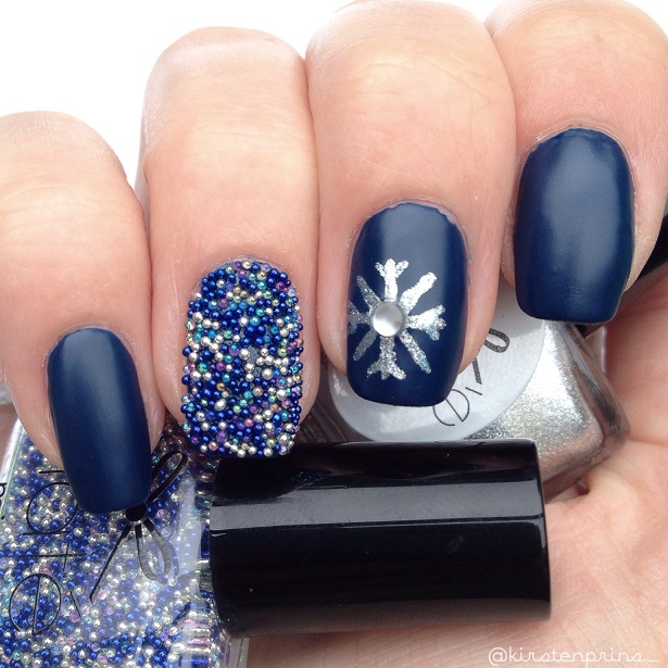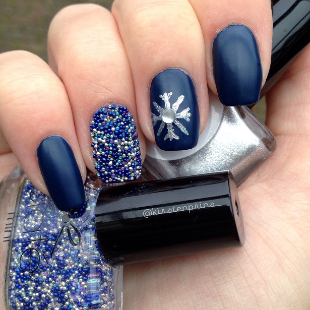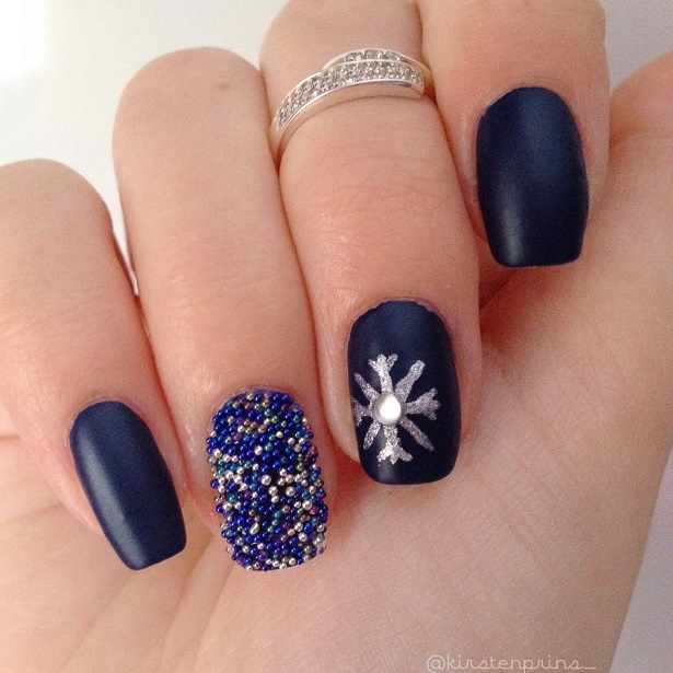 Voor een winters effect teken je nog een zilveren sneeuwvlok op je middelvingers met een penseel, striper of satéprikker. Dit doe je door 4 lijnen te trekken die allemaal samen komen in het midden. Aan de uiteinden van de horizontale en de verticale lijnen teken je nog twee hele korte streepjes in de vorm van een ‘v’. Om de sneeuwvlok helemaal af te maken plak je nog een zilver steentje in het midden en ten slotte breng je nog een (matte) top coat aan over al je nagels, maar kijk uit met je ringvingers. Ik heb tot nu toe elke keer gehad dat de kleuren van de caviar pearls vervaagden zodra ik er een top coat over aan wilde brengen. Wat je wel kunt proberen is er een druppel top coat op laten vallen zodat de top coat zich vanzelf over je nagel verspreidt, het kwastje van de top coat kun je beter niet gebruiken over de caviar pearls.