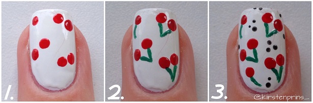 Begin met je ringvingers. Pak er een dotting pen bij en zet een aantal stippen op je nagels met rode nagellak. Daarna teken je de groene steeltjes van de kersen met een penseel, striper of een satéprikker. Als je helemaal tevreden bent over de hoeveelheid kersen op je ringvingers en je hebt nog veel witte ruimtes op je nagel over, dan stip je met een satéprikker of een smalle dotting pen hier en daar nog een paar kleine stipjes op je nagels met zwarte nagellak.