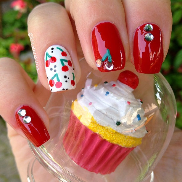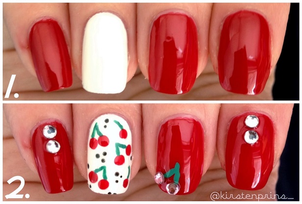 Op je pinken en wijsvingers plak je twee zilveren steentjes onder elkaar op het bovenste gedeelte van je nagel, en op je middelvingers maak je nog twee kersen door twee roze of rode steentjes linksonder op je nagel te plakken en er een groen steeltje boven te tekenen. Breng ten slotte nog een top coat over al je nagels aan en dan ben je klaar!