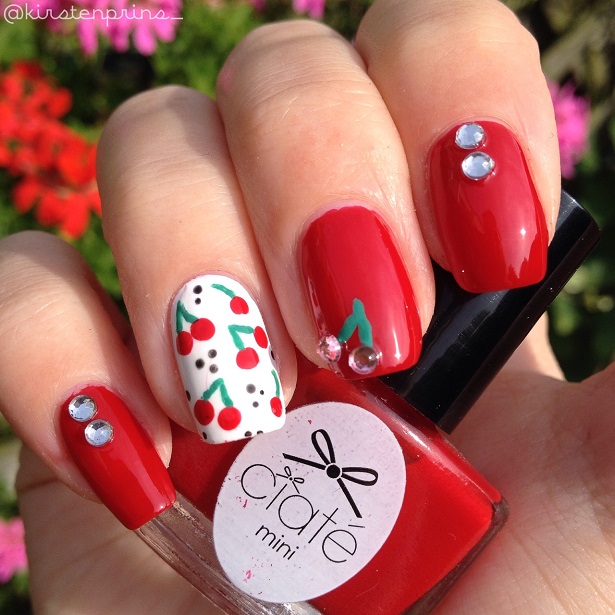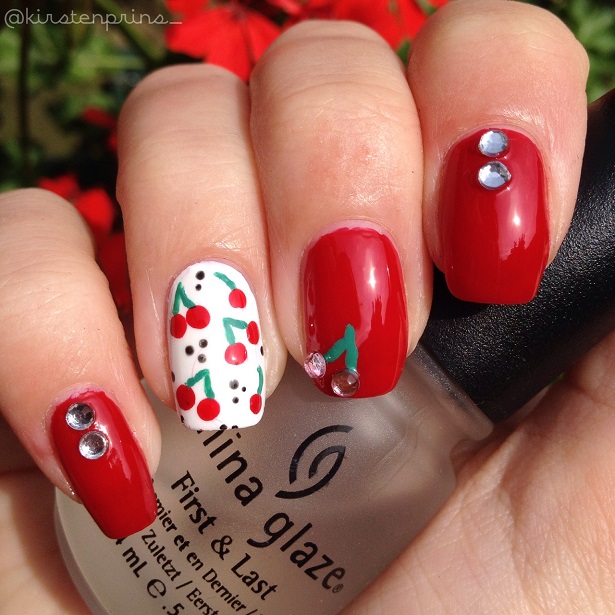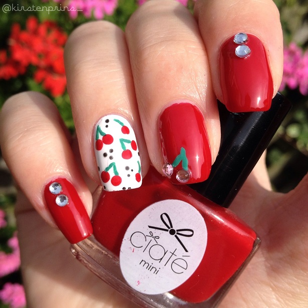 Vandaag heb ik weer een nieuw nail art design gemaakt, dit keer met kersen, steentjes en veel rode nagellak : ) Mijn design is geïnspireerd op het design van @badgirlnails (Instagram account). Kijken jullie mee?