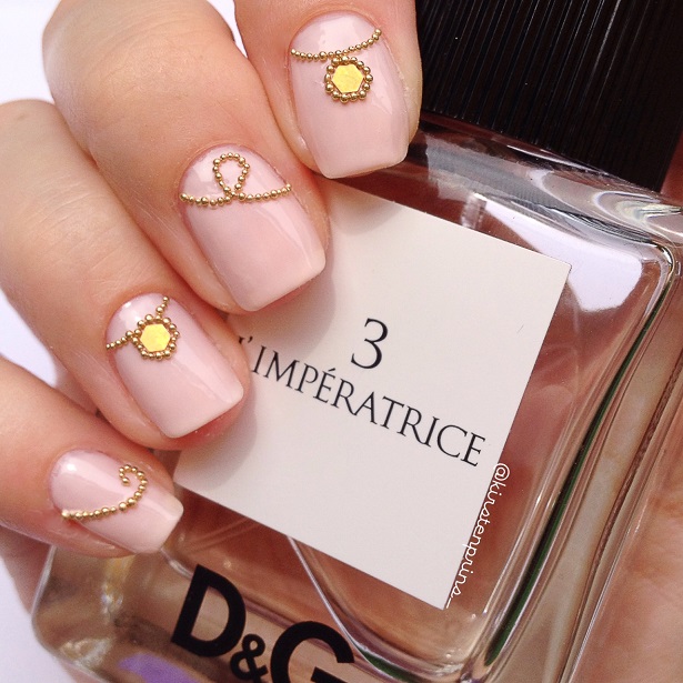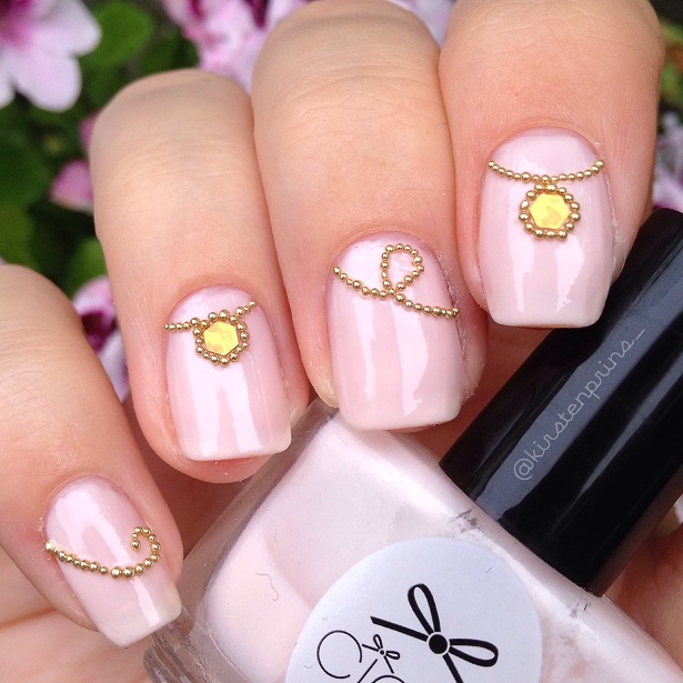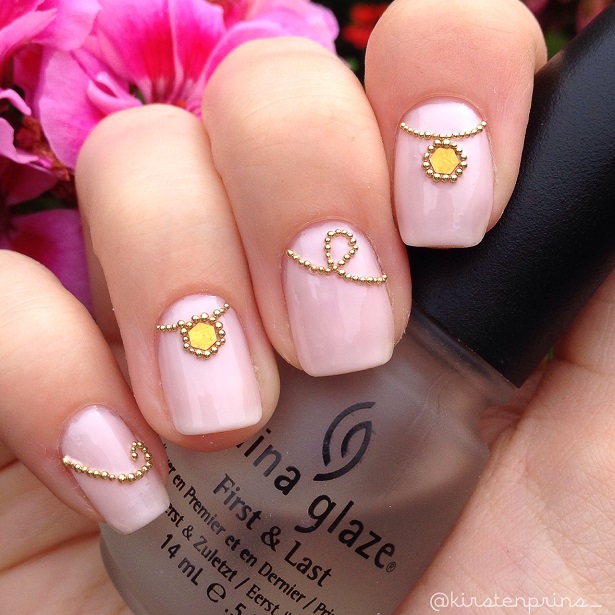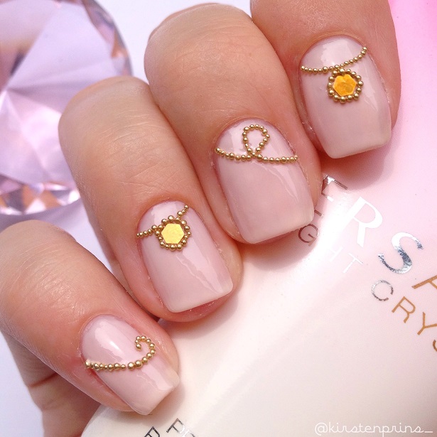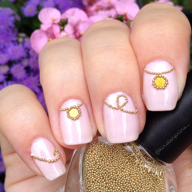 Ik heb geen stap voor stap foto’s gemaakt omdat het design niet zo ingewikkeld is qua technieken, maar je moet wel je geduld kunnen bewaren 😉 Eerst breng je een base coat aan over je nagels en vervolgens lak je ze allemaal roze. Ik heb twee lagen Amazing Gracie van Ciaté aangebracht over al mijn nagels, en toen deze lagen droog waren ben ik nagel voor nagel gaan werken. Begin bij je pink en breng nog 1 laag nagellak aan. Terwijl deze laag nog nat is pak je met een dotting tool of een satéprikker een voor een de gouden micro parels op en druk je ze voorzichtig in de nagellak.