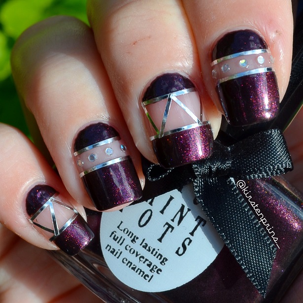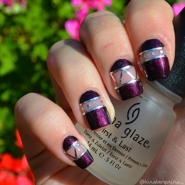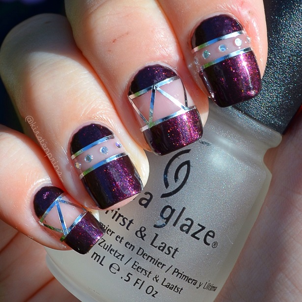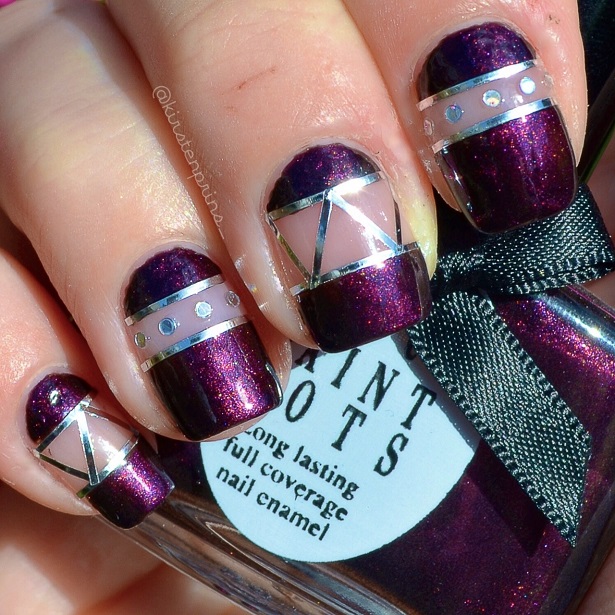 Als de paarse nagellak droog is plak je op elke nagel twee strookjes zilveren striping tape op de overgangen van paarse nagellak naar geen nagellak. Gebruik een groot stuk striping tape zodat je hem goed vast kan houden en knip (als de tape goed op je nagel zit) met een nagelschaartje het teveel aan tape aan de zijkanten van je nagels weg.
