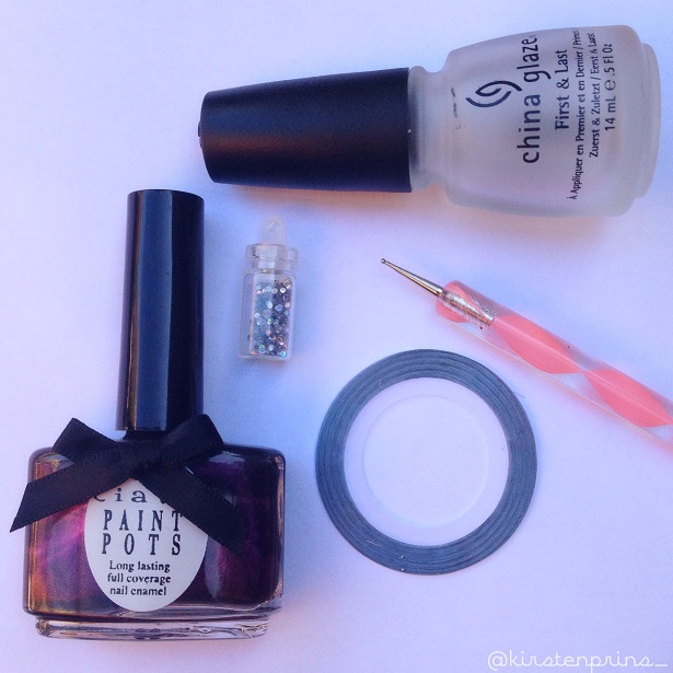 Breng een base coat over je nagels aan en lak ze daarna zoals op foto 1 staat aangegeven. Mijn duimen heb ik alleen paars gelakt, maar je kan ze natuurlijk ook in hetzelfde cut-out design maken zodat alles bij elkaar past. Het onderste gedeelte van mijn nagels heb ik gewoon gelakt, en omdat de bovenkant van je nagels een beetje lastig wordt met het kwastje heb ik deze gedeeltes met een dotting tool paars gemaakt.