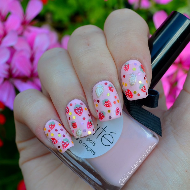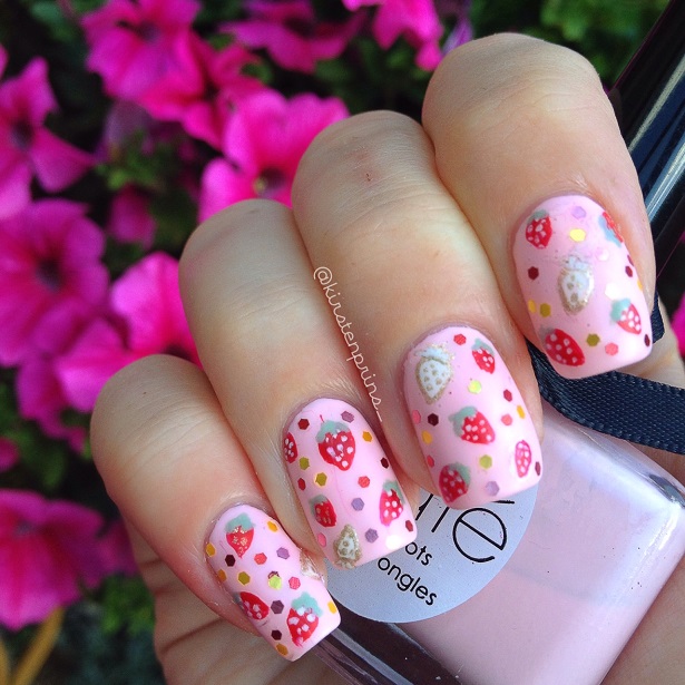 Breng eerst een base coat aan over je nagels en breng daarna een roze basislaag aan. Vervolgens maak je met rode, witte en gouden nagellak en een nail art penseel aardbeien op je nagels van verschillende grootte en kleuren. Doe lekker gek! Maak op elke nagel 4 of 5 aardbeien en laat wat lege plekken over voor de sequin glitters.