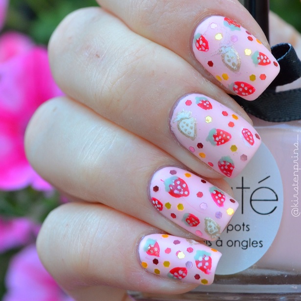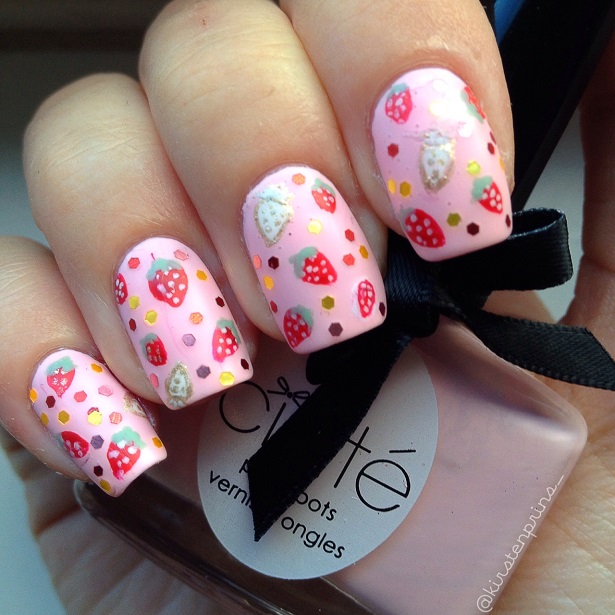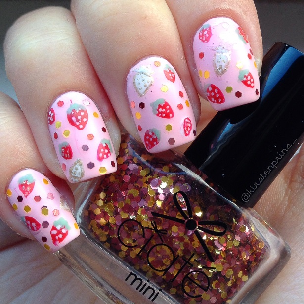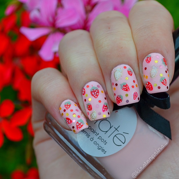 Nu komen alleen de sequin glitters nog. Breng eerst een top coat over je nagels aan en leg dan de glitters een voor een met een dotting tool op je nagels. Vul de lege ruimtes tussen de aardbeien mooi op met een paar glitters. Als je helemaal tevreden bent breng je nog 1 laag top coat aan over je nieuwe design en dan ben je klaar!