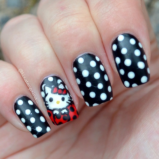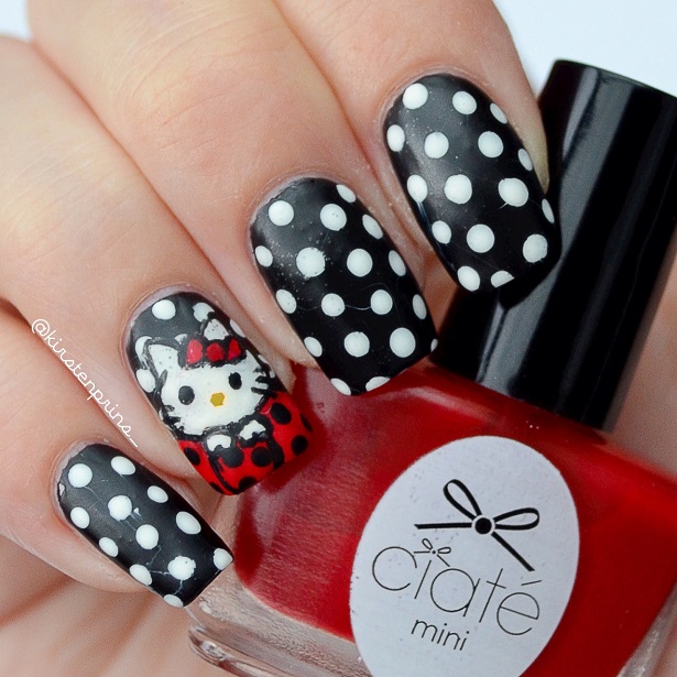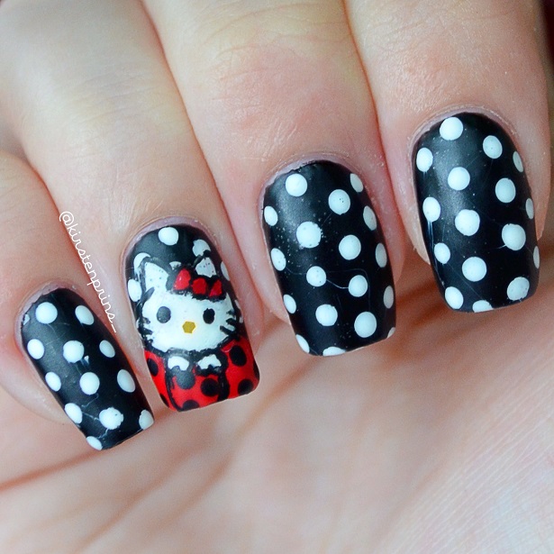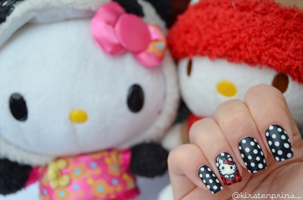 Als de zwarte nagellak en de stippen goed droog zijn, begin je aan de Hello Kitty op je ringvingers. Ik heb als voorbeeld de Zatchels tas genomen en die ben ik gewoon na gaan tekenen. Je kunt het beste beginnen met de rode strik. Ik heb de strik eerst in het wit getekend zodat de rode kleur daarna beter opvalt op de zwarte ondergrond. vervolgens begin je aan het witte hoofdje en de pootjes van Hello Kitty, die je weer omlijnt met een dun zwart lijntje. Als de witte lak droog is teken je de details in het hoofd en maak je een rood strikje op haar oor om het helemaal af te maken. Breng een top coat over je nagels aan en dan ben je klaar!