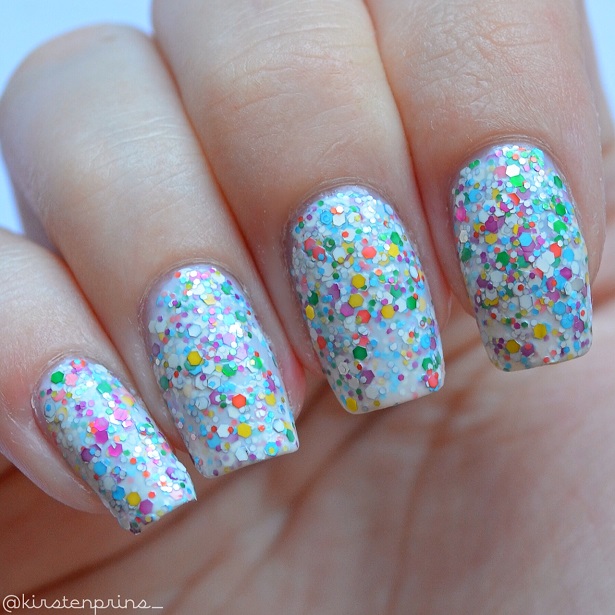 Ik heb op deze foto’s alleen een transparante base coat op mijn nagels gedaan (‘First and Last‘ van China Glaze) en vervolgens 4 dunne laagjes Jolly Jewels 115. Ik heb dit keer geen top coat gebruikt zodat ik de nagellak goed kan laten zien, maar voor een gladde finish is een top coat wel aan te raden. De glitters willen hier en daar namelijk wel een beetje omhoog komen.