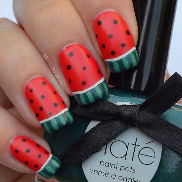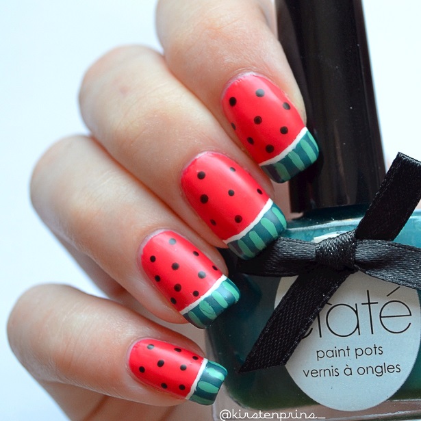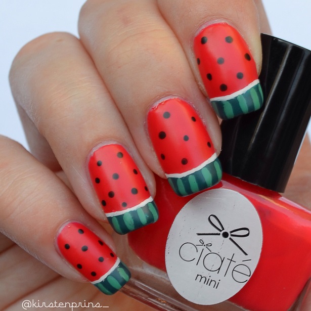 Op de donkergroene tips trek je nog een paar lichtgroene, verticale strepen met een penseel of een striper. Als je hiermee klaar bent, hoef je alleen nog maar een top coat aan te brengen en dan zijn je fruitige nagels klaar! 🙂
