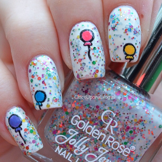 Om je nagels helemaal feestelijk te maken breng je nog wat gekleurde glitter nagellak aan rondom de ballonnen. Mocht je nou geen glitter nagellak hebben, dan kan je natuurlijk ook met een dotting tool allemaal kleine stipjes in verschillende kleuren om de ballonnen heen maken. Het zal er net zo feestelijk uit komen te zien 😉 Breng ten slotte een top coat aan en dan ben je klaar!o6o13o9o3o5