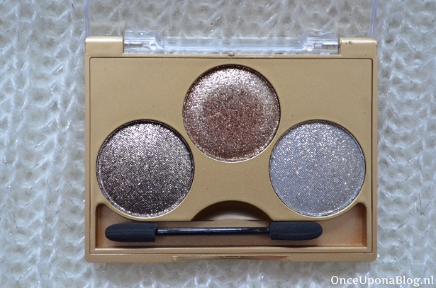 De palette bestaat uit drie mooie shimmer oogschaduwen: donkerbruin, bruin en zilver. Er zit ook een applicator in het doosje, maar ik gebruik toch liever mijn eigen kwastjes. Op de afbeelding hieronder zie je hoe de verpakking eruit ziet, het glanst heel erg!