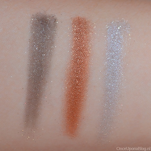 De oogschaduwen zien er als volgt uit op mijn arm. Ik heb voor deze swatches de applicator gebruik en ik heb hiermee twee keer over mijn arm geveegd. De pigmentatie is in ieder geval goed! De eerste kleur is donkerbruin met glitter erin. De tweede kleur ziet er op mijn arm anders uit dan in de verpakking, op mijn arm is de kleur meer brons/oranje en hij is heel erg gepigmenteerd! De laatste kleur is wit/zilver met glitters.