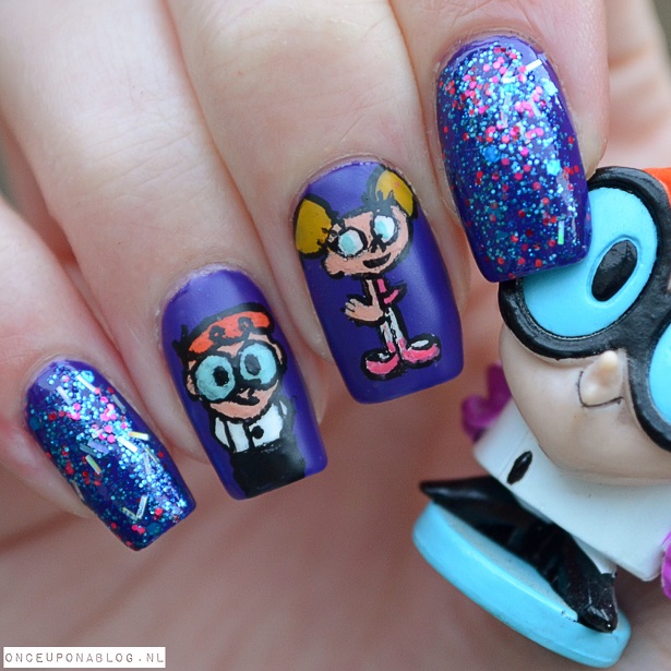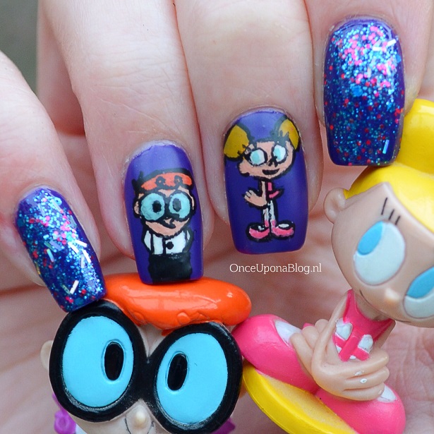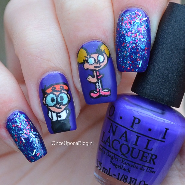 Ik heb geen stap voor stap tutorial gemaakt, omdat ik echt veel te lang bezig was met het tekenen! Ik heb op internet een een duidelijke afbeelding van Deedee en Dexter opgezocht en die heb ik geprobeerd na te tekenen. Op YouTube staan wel filmpjes hoe je Dexter moet tekenen op je nagels. De paarse nagellak is ”Do You Have this Color in Stock-holm?” van OPI, de glitterlak op mijn ringvinger en pink is ”Monte Carlo” van Ciaté London en Dexter en Deedee heb ik met acrylverf getekend.