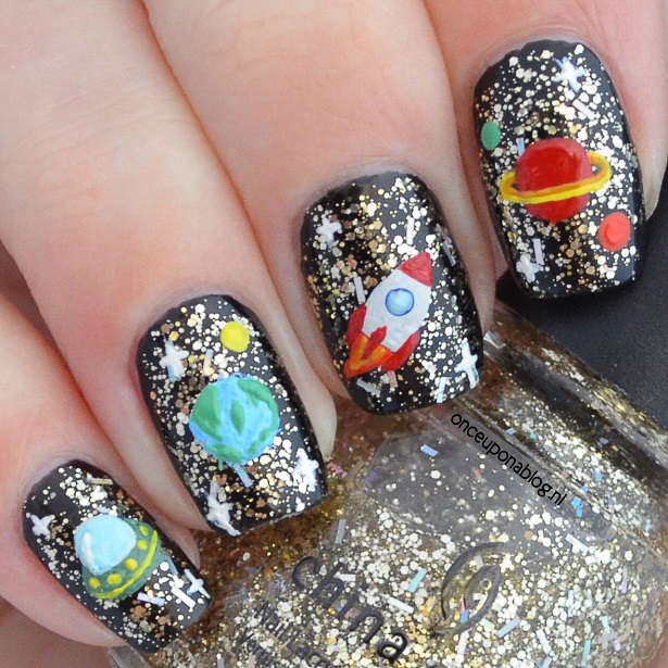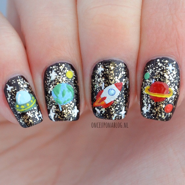 The next design is made by me : ) I wanted to create a simple mani with a black base and gold glitters on top. But when I finished my design, it looked a bit boring. The gold glitter with the black polish kinda looked like a galaxy mani, which brought me on the ide to make a space mani! I like how this mani turned out!
