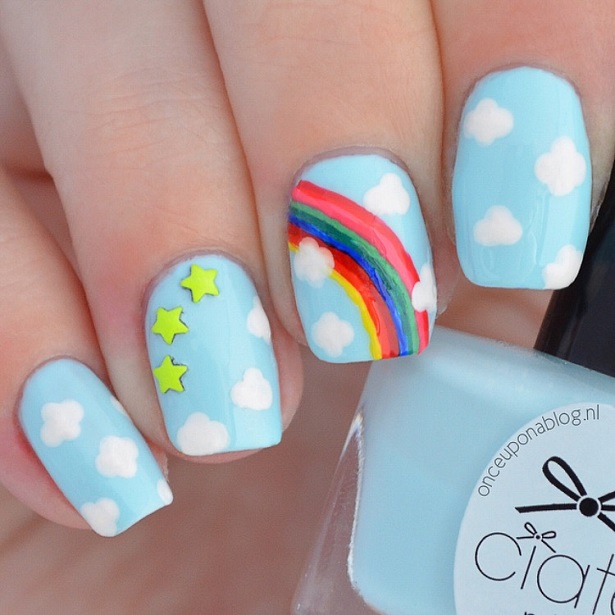 The clouds are really simple to create. To make a cloud, you will need a dotting tool and white acrylic paint/nail polish. Add three of four dots next to each other, and your cloud is done!
